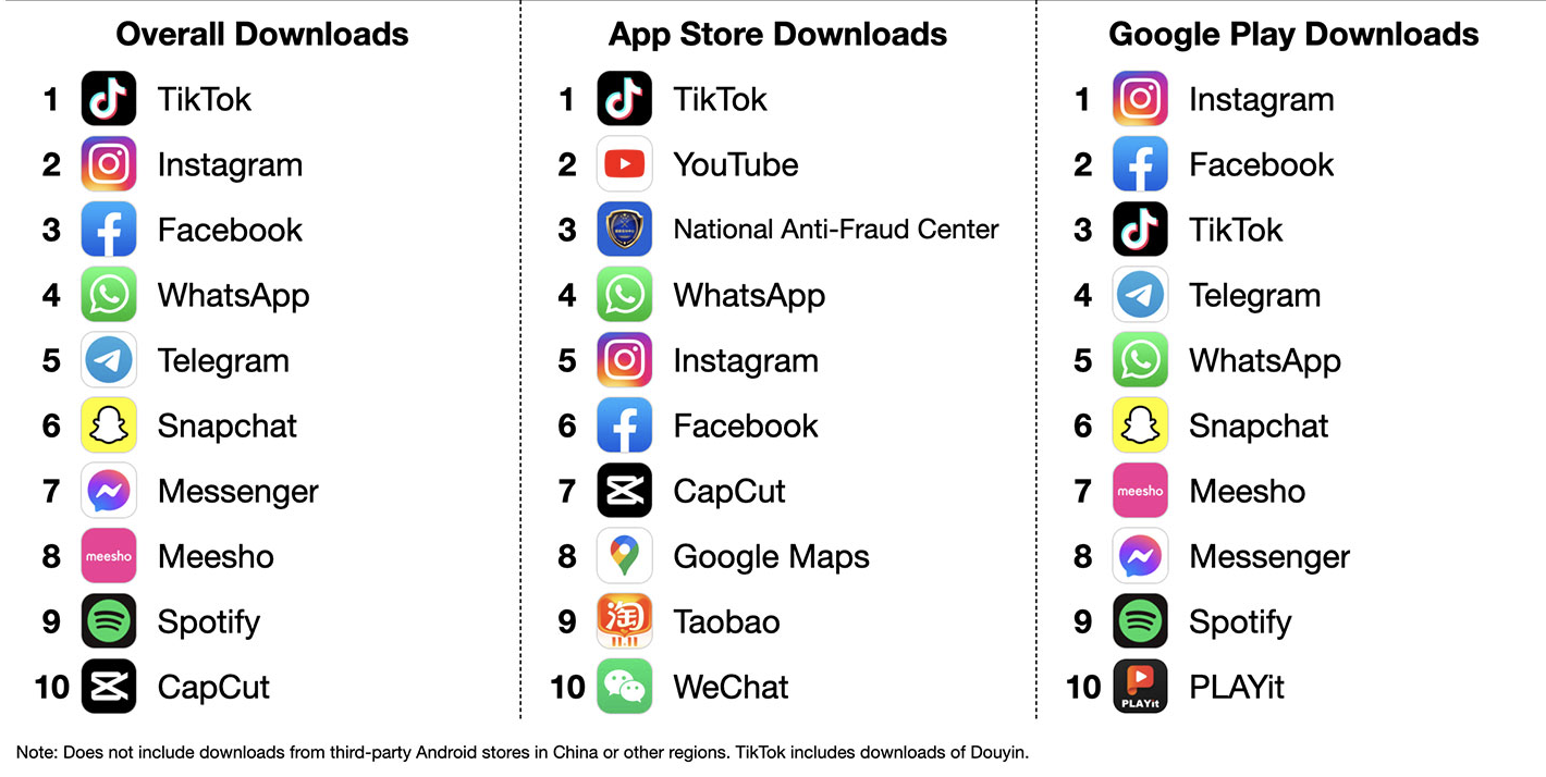 2022年下载量最大的移动应用包括TikTok、Facebook和Spotify等。